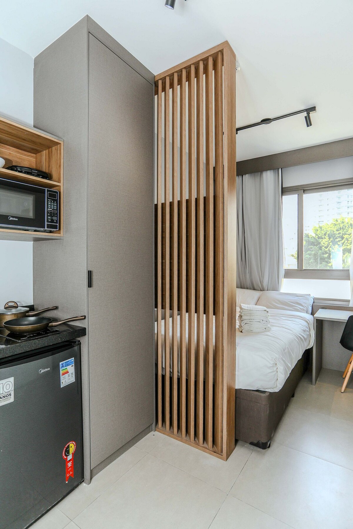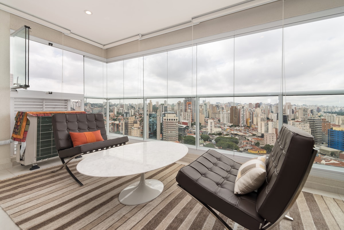 Beautiful apartment located in the Perdizes region, full of style. Super complete studio with all the structure, air-conditioning, private bathroom, kitchen, refrigerator, microwave, Smart TV, fast Wi-Fi, balcony with an amazing view. The Condominium has all the necessary structure for your comfort, swimming pool, fitness center, coworking, laundry. It has a spectacular location overlooking the Allianz Parque stadium, the stage of several concerts and games. And next to two malls (Bourbon and West Plaza).