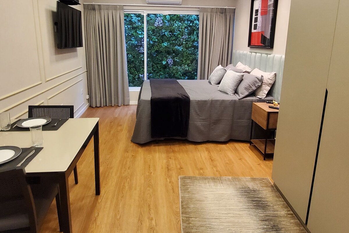 New loft, decorated with charm and elegance in Perdizes, 300 meters from Shopping Bourbon. Fully equipped with Vertical Garden, Queen-Size Bed, Minibar, Wi-Fi, Office with Wired Internet, 4K HDR 50-Inch Smart TV, Microwave