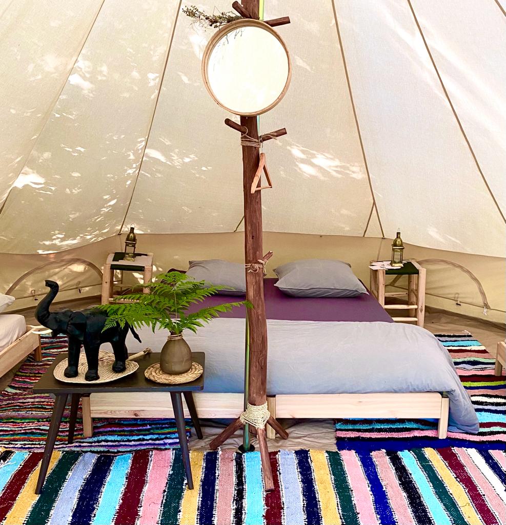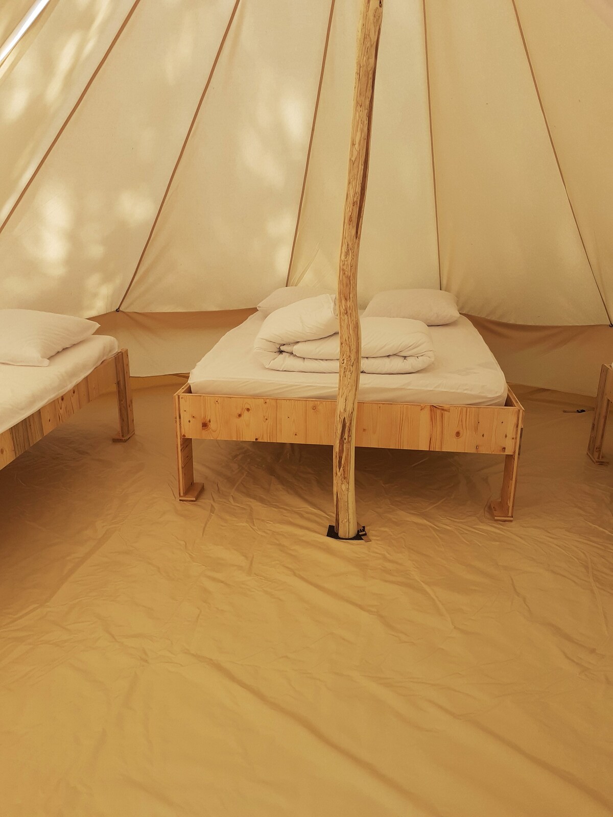 Sleep in a canvas tent but in a real bed, a unique experience that combines the pleasure of nature with the comfort you have at home. A cozy and romantic setting since this xxl tent measures 6 m x 4 m. You will also have a closed part outside the bedroom as well as an awning in case of bad weather or just to get in the shade...