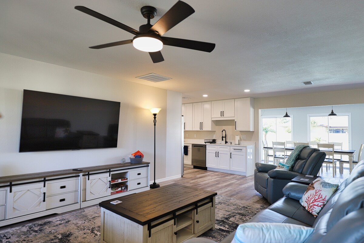 Welcome to your home away from home. This inviting, happy home is spacious, bright, comfortable, and situated in a quiet neighborhood - conveniently located to 3 nearby beaches and the historic downtown Venice. The home is newly renovated with an open floor plan and private pool. The master bedroom and en-suite has a king-sized bed. Second bedroom offers your choice of bed configuration with the option for two XL twin beds which can be pushed together to create the equivalent of a king-sz bed.