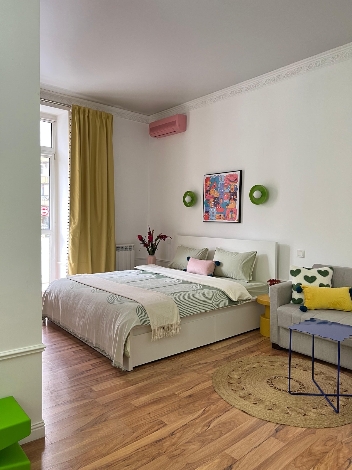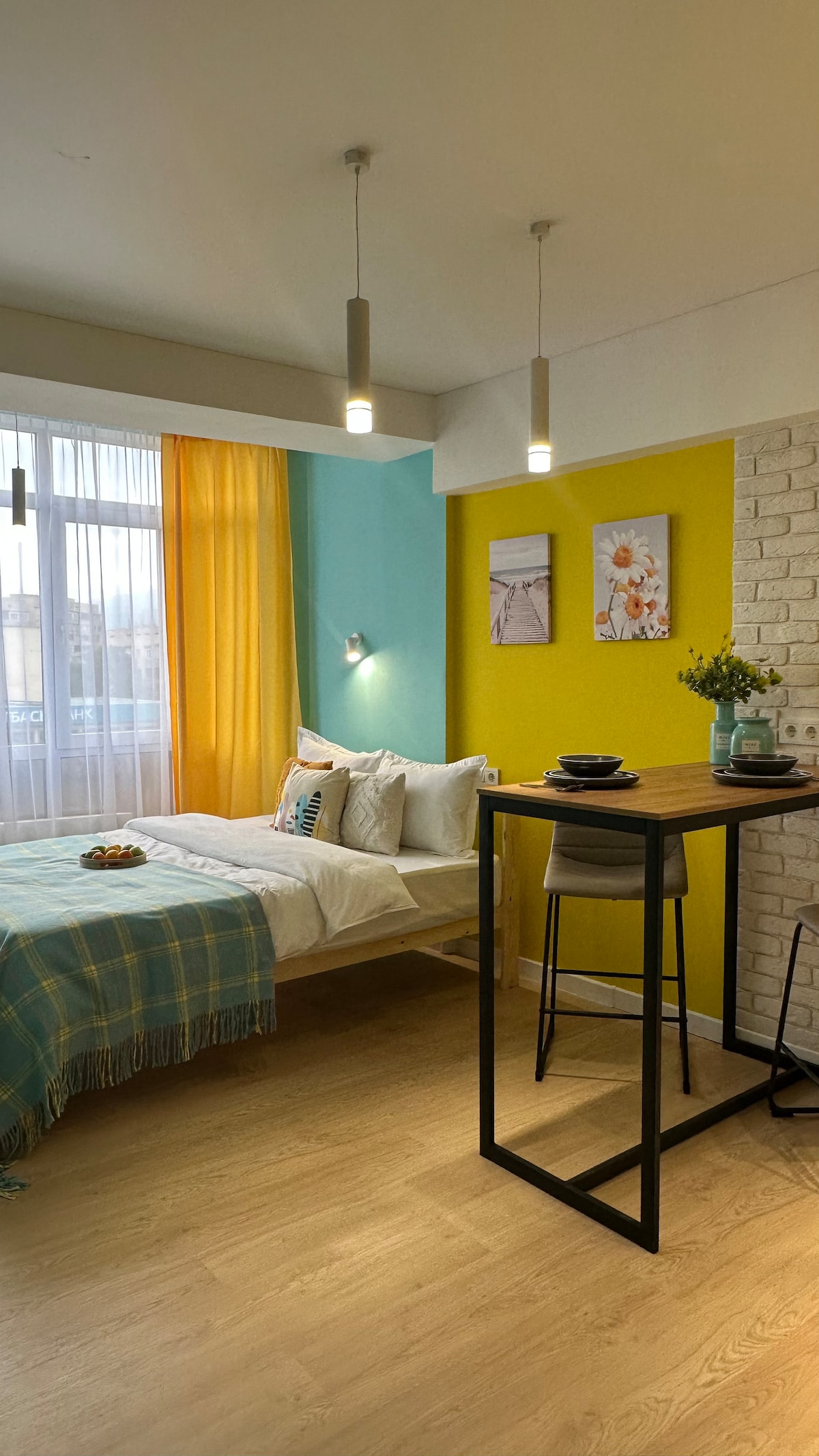 Dopamine apartment in the city center! A great place for a comfortable stay: • A spacious and bright living room with high ceilings. • Equipped kitchen for those who like to cook. • A cozy bedroom with a great city view. • Within a walking distance there are shops, cafes and restaurants, parks, pedestrian streets. We created this space to make you feel at home, and the city rhythm is always nearby.