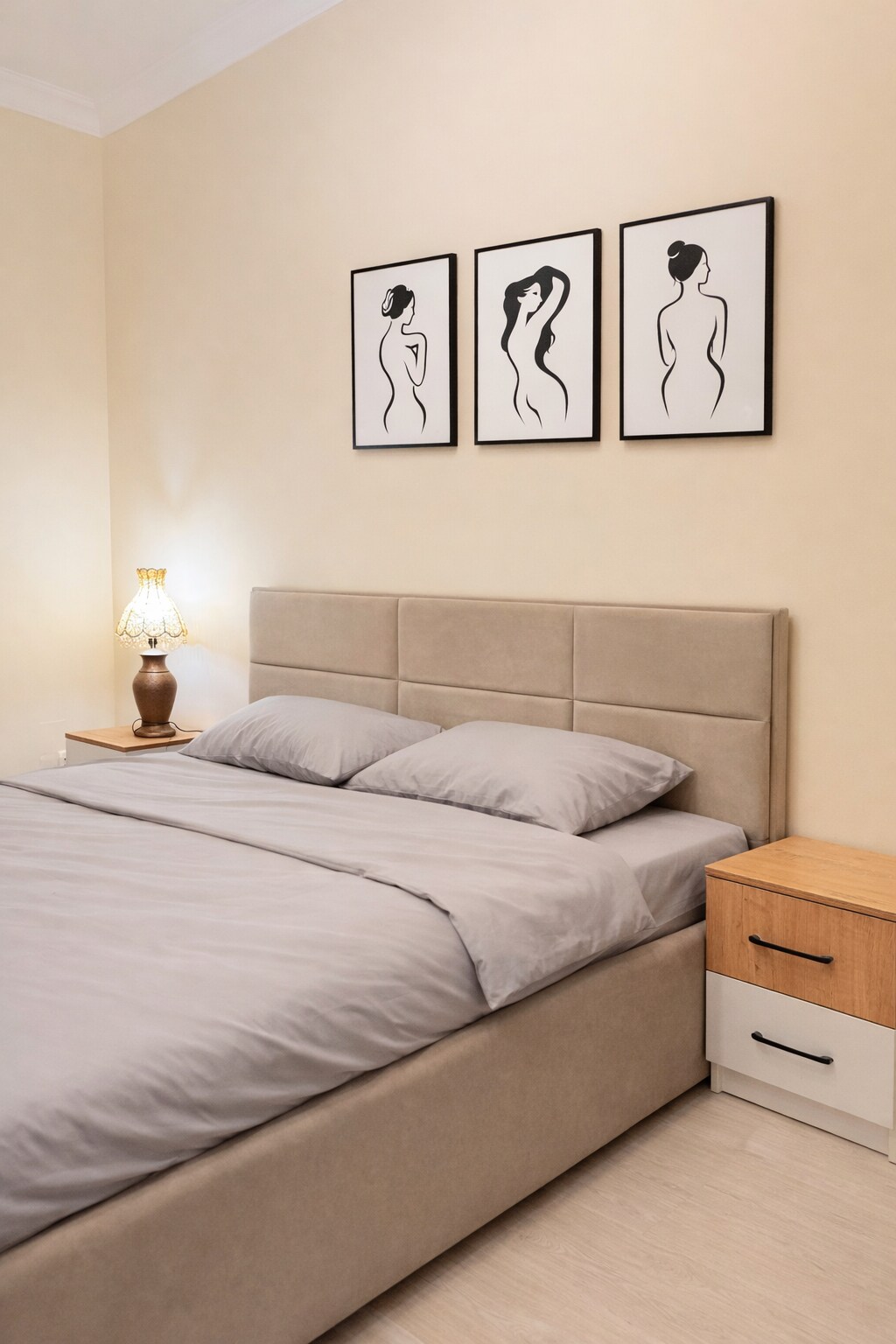 Brand new full-fledged 2-room apartment after stylish renovation in a new comfort class residential complex! New custom furniture, chic renovation, very beautiful enclosed courtyard, high-speed elevators, beautiful entrance, video surveillance, security. An apartment you'll want to live in. After all, it has all the amenities for a comfortable stay. A very cozy kitchen with everything you need to cook delicious breakfasts, lunches and dinners. Beautiful bedroom with a large bed and a comfortable mattress