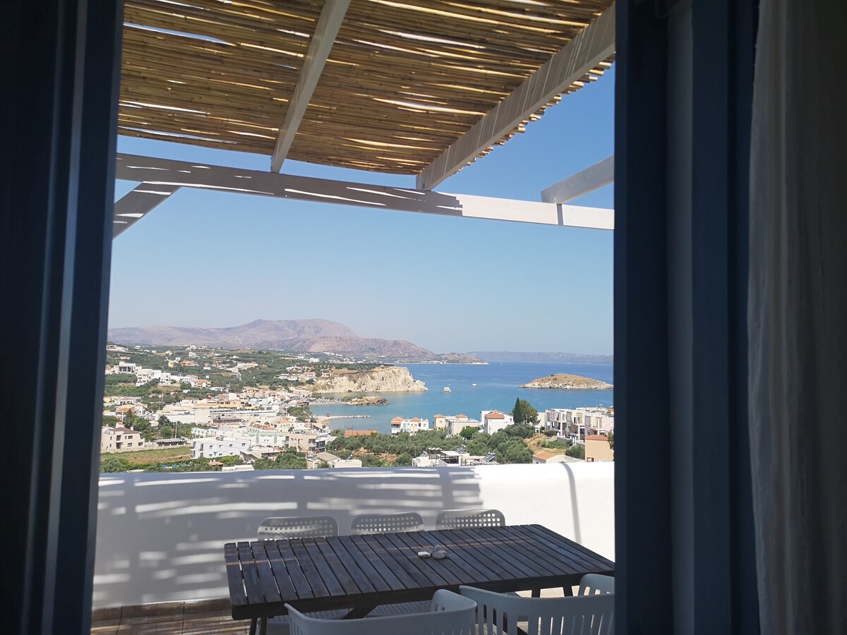 Marvelous sea VIEW from your arched balcony. Private newly renovated big suite, double bed, kitchen with utensils, bathroom, balcony with hammock. SUPERB, PRIVATE, AND COSY. You will feel at home. Breakfast in request:) Peaceful, quiet retreat away from the bustle, 7 min walk to amazing Almyrida sandy beach, shops, restaurants, and the best taverna with homemade food a few steps away. Close to Samaria gorge, Balos, Elafonisi beaches, Chania and Rethymno. 7olivescrete