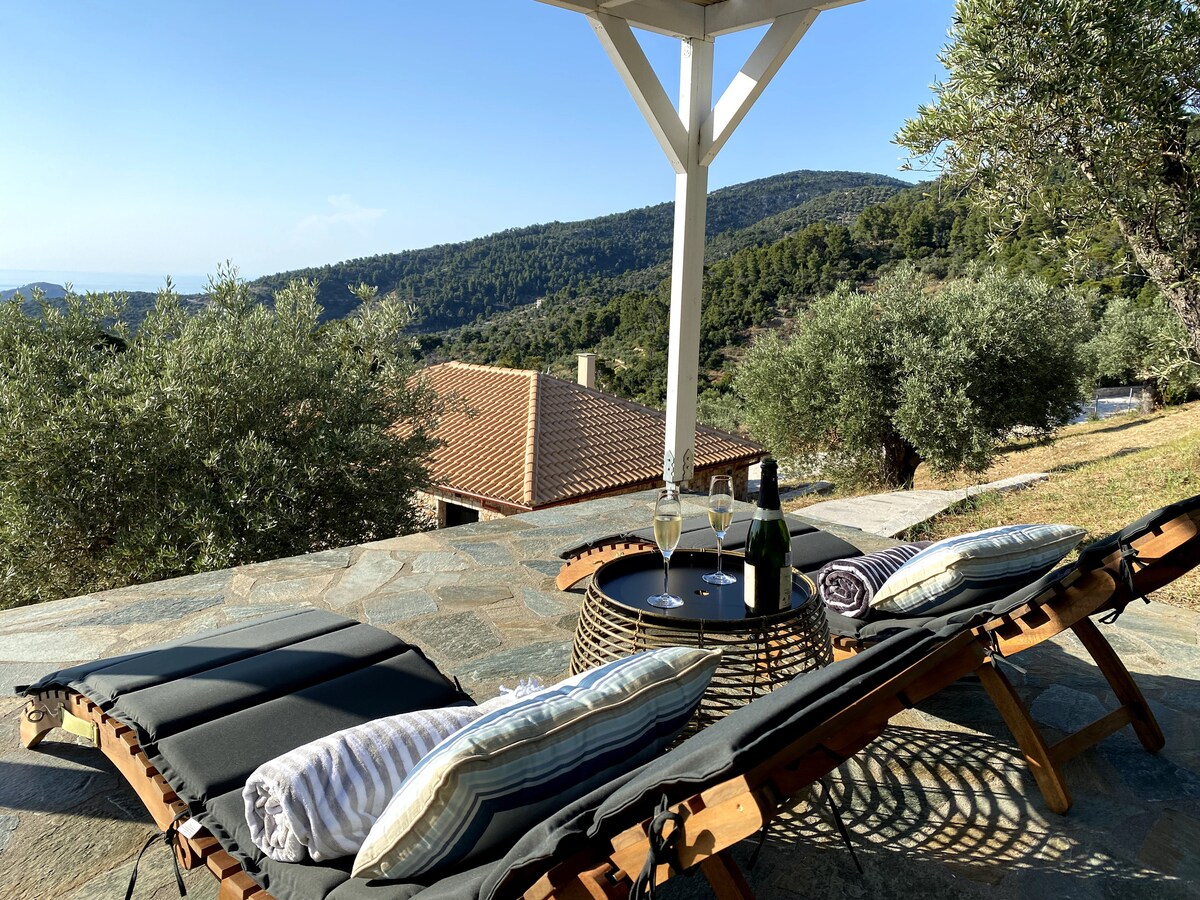 Tucked away in a private 4,000 m² olive grove with views of Skopelos town and the Aegean Sea, Apomero Cottage offers peaceful seclusion just a 15-minute walk from town. Once used during olive harvest season, the cottage blends traditional Greek island architecture with modern comfort. It consists of two buildings: one with a bedroom and bathroom, and another with a living room, second bathroom, and a sheltered, fully equipped kitchen and dining area. An organic vegetable garden is also a plus.