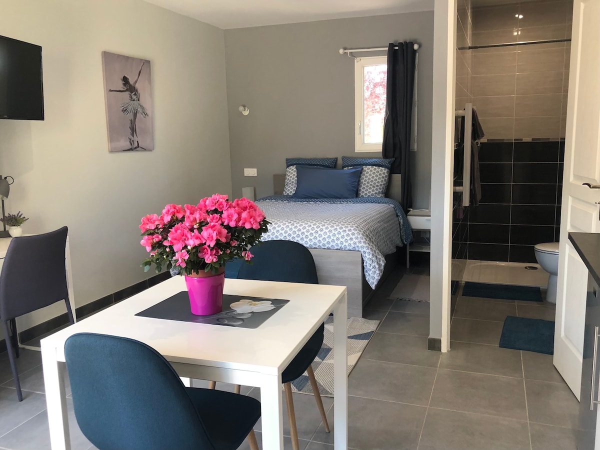 Large studio on the ground floor, completely renovated in a contemporary style, modern and functional. For your relaxation you will have a bathtub. In the heart of a small village, on the church square. All amenities nearby. Free parking nearby and self check-in. Bus stop 100 m away that will take you to Avignon in 30 min. Parc Spirou and Wave Island are 5 min away by car. Mt Ventoux 45 min, the sea 1 hr 15 min. Accommodation equipped with air conditioning, Wi-Fi. Highway exit 3 km away