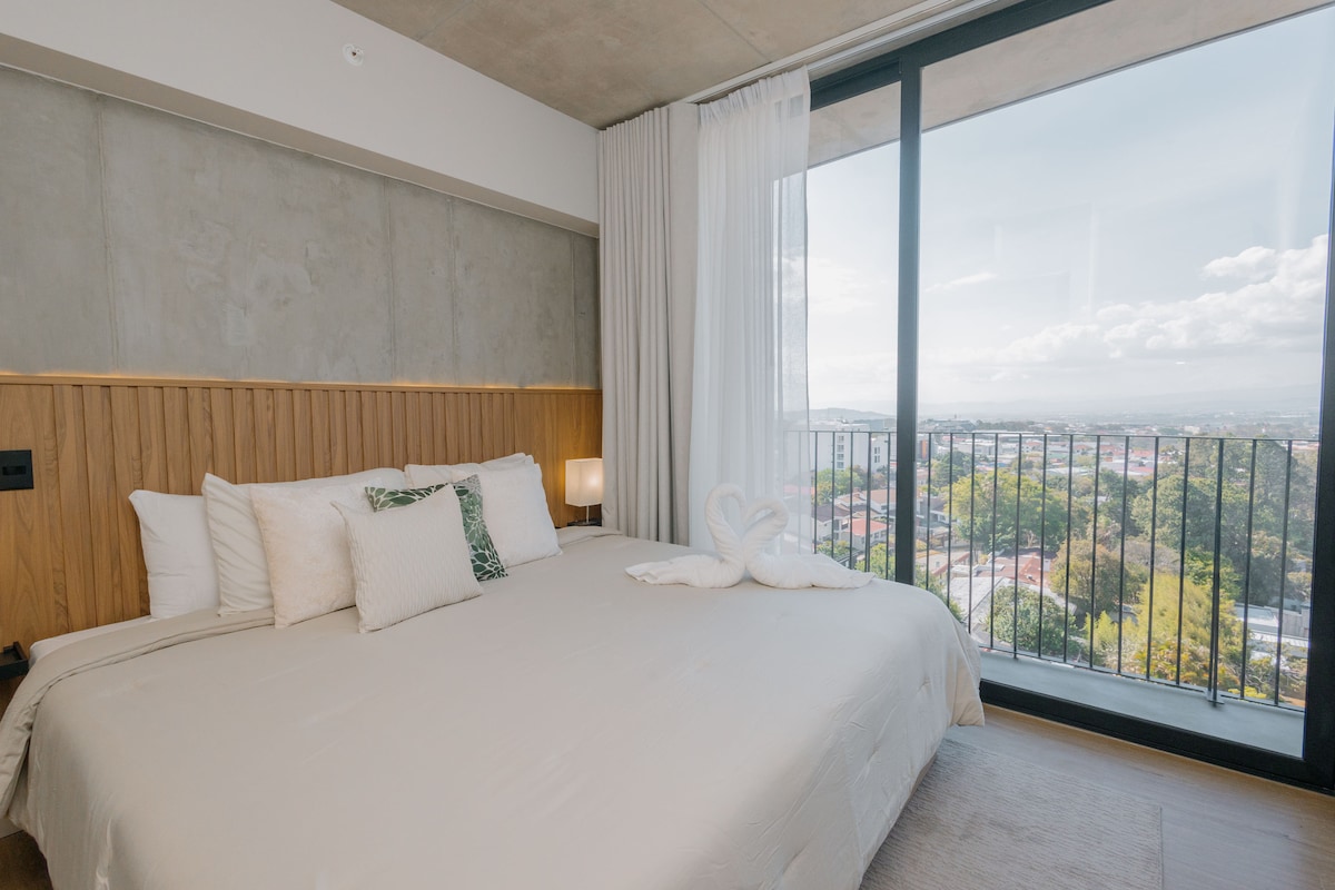 ? Stunning & Spacious 1BR/1BA Condo! Perfect for medical tourism, remote work, business, or family stays, in the most exclusive area of Escazú! Enjoy breathtaking Central Valley & mountain views ?, just minutes from Multiplaza Mall, top dining, pubs, shops & artisanal cafés. ? Private parking, 24/7 security, elevator & stairs. Plus, relax with a pool, gym & lightning-fast 100Mbps WiFi! ??♂️? Cozy comfort & convenience—experience it all and leave your journey with us !- AC in master BR ✨