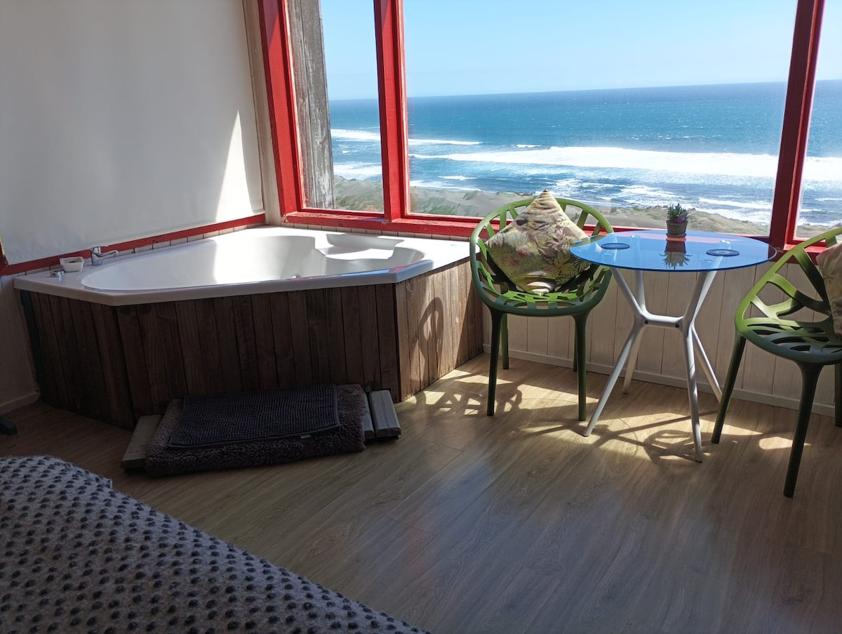 cabaña para dos personas con jacuzzi y vista panoramica al mar de pupuya , bajada a la playa por las dunas que están bajo la cabaña. wifi, leña para la bosca, parrilla a gas y completamente equipada, recomendamos autos con buena tracción y expertis al volante ya que el último tramo es subida de tierra firme. Con lluvia se puede dejar el auto a una cuadra y caminar hasta la cabaña Contamos con sábanas y artículos de aseo en baño y cocina.
