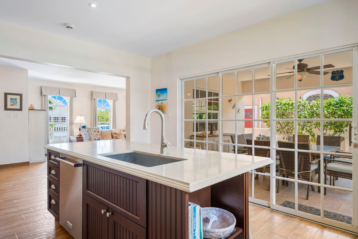A unique and charming way to experience the island. - Private villa located at the end of a cul-de-sac road - Free WiFi and Free Parking - Amazing Shaded Patio and Palapa with Outdoor Dining and access to Pool - Caribbean but Modern Decor for a Classy Vacation - Managed by a professional company with activities specialists available - A luxury garden for true outdoor living Sleeps 6 adults/children and one infant. Enjoy your pool, BBQ pit, TV, dishwasher, outside shower, and king-size mattress