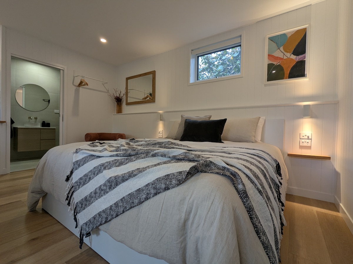 You will have the rear half of our house. Self contained with its own entrance, 2 bedrooms, bathroom,huge living area, laundry and tiny kitchen, BBQ and outdoor seating in an undercover area. Perfect for a quiet breakfast.It is entirely private and you have a lovely garden,outdoor area and under cover parking. Free bikes and free wifi. There is a big tile fire for winter and always plenty of wood.