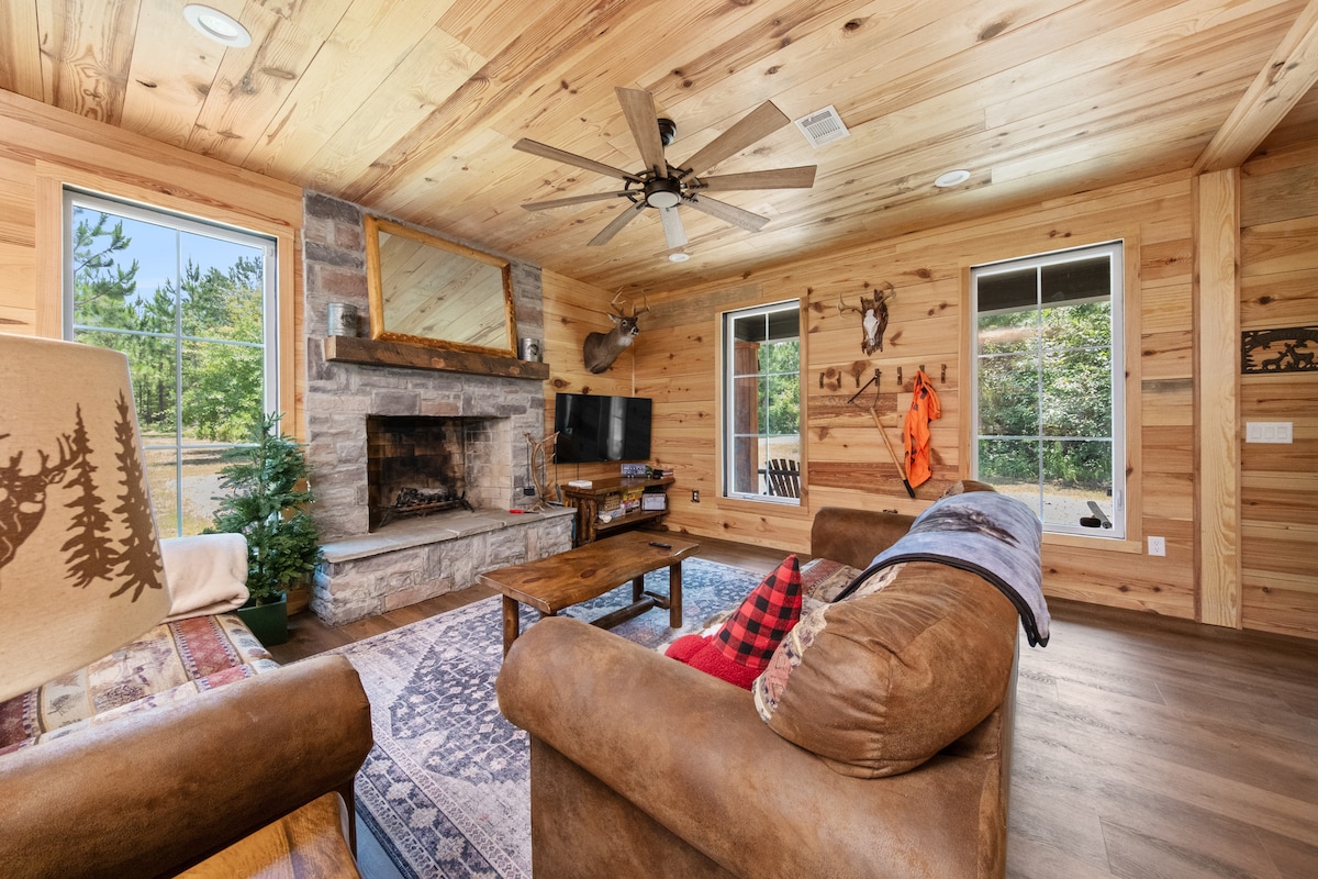 Only 15 min. From I-75, Nestled in a private natural setting, this 2-bedroom, 2-bathroom cabin offers a tranquil escape. Unwind on the furnished patio, gather around the fire pit, or enjoy a barbecue on the outdoor grill. The spacious yard, flatland and hillside areas provide ample space for family fun. Stroll through the greenery, relax by the pond, or simply soak in the serenity of the surroundings. Create lasting memories in this family-friendly retreat.