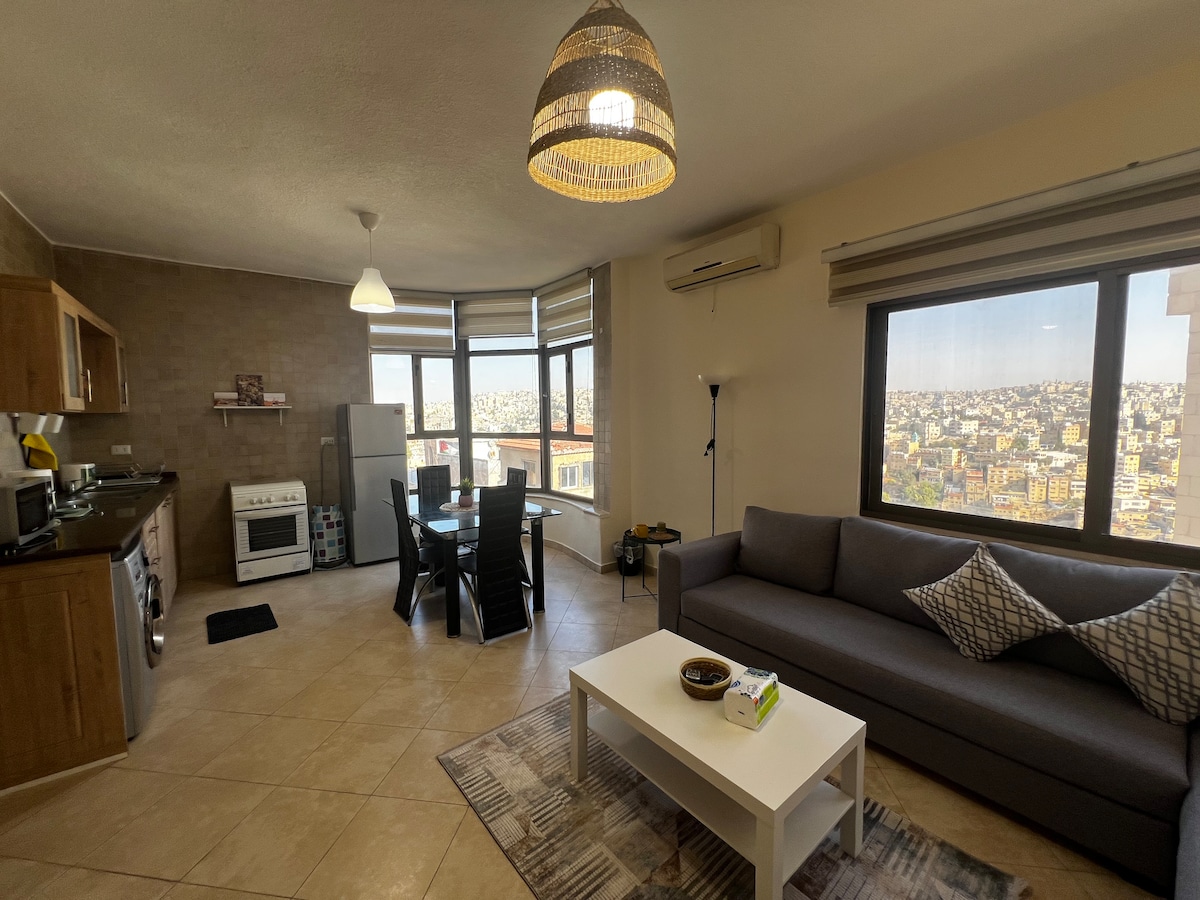 Enjoy a stylish experience at this centrally-located place. 5 min away from Abdali Mall 1 min away from Housing Bank 1 min away from Citi Bank 2 min away from Arab Bank Full kitchen Central cooling and heating High-speed internet Large-screen smart TV Large and comfortable bed Balcony (No smoking is allowed inside. Smoking is allowed only on the balcony).
