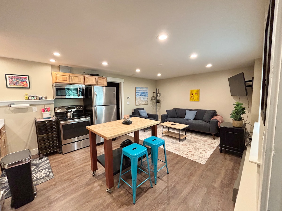 Experience luxury living in this charming basement apartment with a private walk-out garden entrance. It features a fully equipped kitchenette, dining area, and a cozy seating area with a 55" Samsung Smart TV. A king-size bed awaits in the bedroom. The bathroom features a walk-in shower and radiant in-floor heating. The windows have black-out blinds for a restful night's sleep. Enjoy the convenience of an in-unit washer/dryer and the beauty of your private garden. Rich Fir paneling throughout.