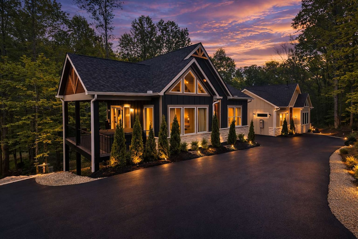 The best of both worlds: tranquil privacy in a heavily wooded backyard, just minutes away from shopping and restaurants. Perfect for romantic weekends or large gatherings. Sleeps 11. Hosts live on-site in a separate space, so you have complete privacy whether relaxing in the hot tub, enjoying pool, ping pong, the fire pit or luxurious covered patio. Close to the Smokies, UT, and 10 miles to Wind Rock outdoor adventure area. 275' circular drive for trailers. 1000 mbps wifi. 5 smart TVs.