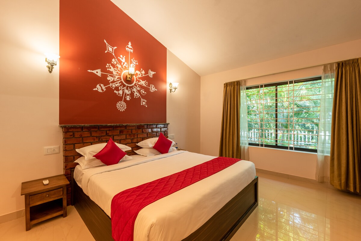 Tucked away in a lush one-acre sanctuary, this pet-friendly mezzanine cottage offers a peaceful escape where nature and comfort come together effortlessly. Inside, high sloped ceilings, warm ambient lighting, and large windows frame calming views of greenery, while a plush king-sized bed and a private loft-style nook add intimacy and charm. Step outside to unwind by the shared swimming pool, enjoy open-air dining, or relax on the expansive lawn with your furry companion.