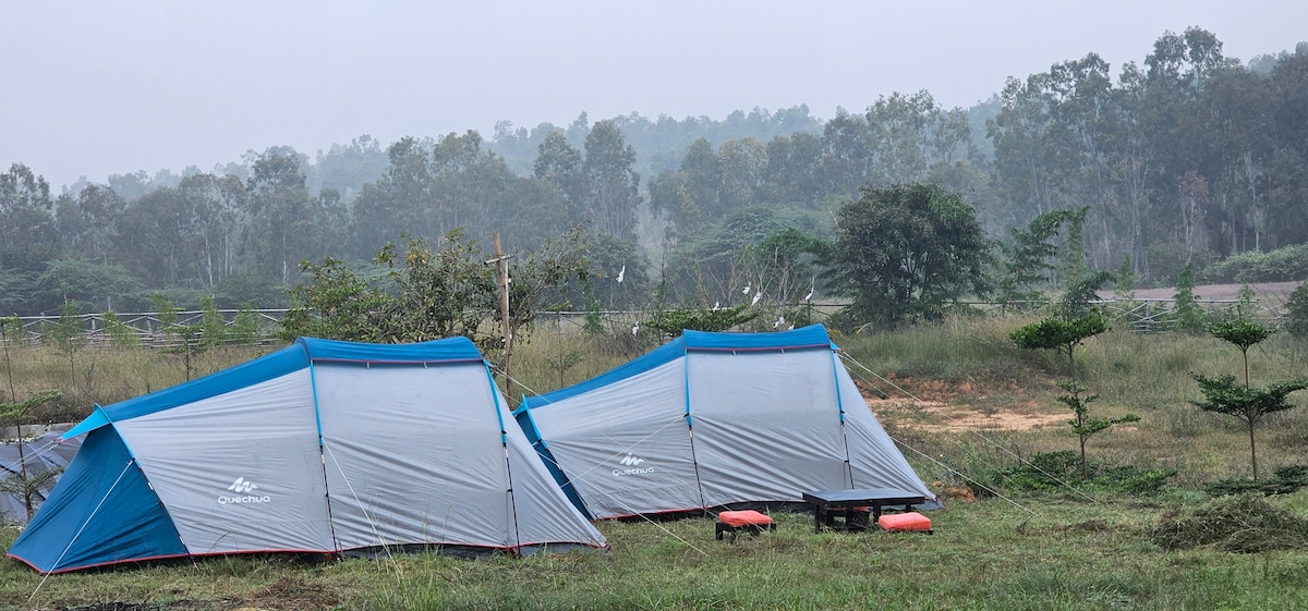 A quaint camp site situated right at the edge of the Ragihalli Reserve Forest (part of the Bannerghatta National park forest range) and beside a pond amidst lush greenery, on a 30 acre property, just about 32 kms from the Bangalore city centre.