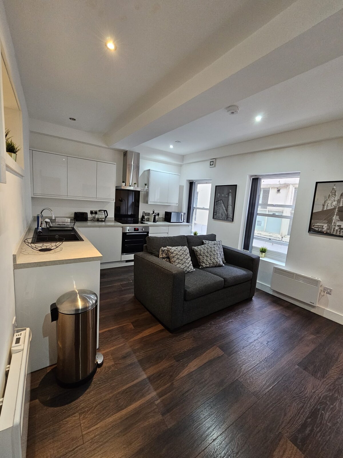 Featured in TimeOut's top airbnbs in Liverpool! Our stylish spacious apartment is located in the centre of Liverpool in front of the Three Graces, one of the most historical landmarks in Liverpool. It is in a prime location only 10 min walk to the Royal Albert Dock, less than 5 mins to Liverpool One and 2 mins to Castle Street. The bedroom is very spacious, incorporating a workspace area & plenty of storage. The kitchen is well equipped for all your needs.