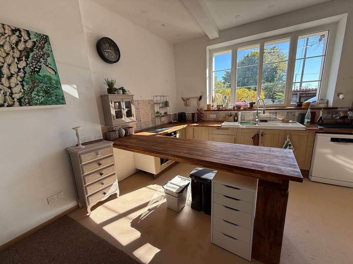 In our country house, just 12 minutes from Angoulême, we invite you to stay in the 50 m2 private apartment that we had furnished for our children, recently completely renovated, equipped and carefully decorated. 2 bedrooms, 1 living room/kitchen with sofa bed and 1 shower room/toilet. From June to September, free access to the terrace and heated pool as well as a private outdoor dining/shaded relaxation area. Up to 6 guests.