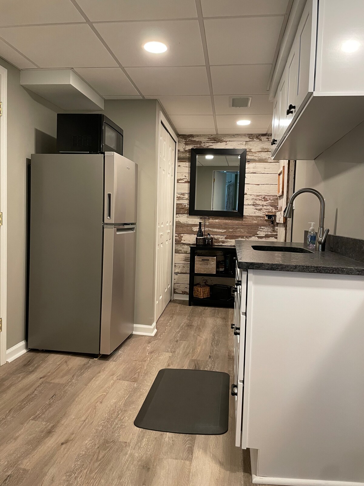 This is a private guest suite (FULL lower level walkout - approx 1,750 sq ft) within our larger 3-story occupied home. A comfortable home-away with 2 bedrooms, 1 full bath, living room, and kitchen with full-frig, dishwasher, coffee maker, electric range, toaster oven, microwave and counter that seats 6. New mattresses, bedding, pillows, and towels. Guests welcome to use back patio area with natural fire pit, covered pavilion with gas fire feature, grill and hot tub. Great Wifi and Smart TV.