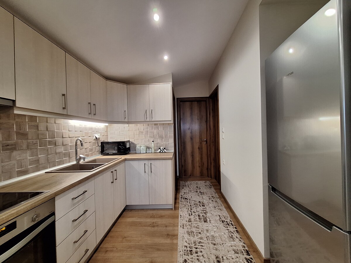 The studio/apartment offered is 22 sq.m., with an open space, it has a double and a single bed, with a full kitchen (4 burners, oven, cabinets and a refrigerator with a freezer of normal size), wardrobe, separate bathroom, with a private balcony and a yard.