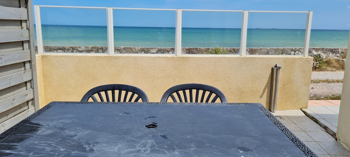 Rated 3***. Direct access to the beach. Relax in this unique and quiet accommodation. Renovated house, LOTS of light, large bay windows, sunny sea view. Stairs with 7 steps to living room, kitchen, French window with outdoor access. Then 3 steps to the veranda. It has 3 terraces well exposed according to the wind. Beautiful view of the sea or the fields of culture. 3 cars max. The windows are TRYBA brand double glazing. Pellet stove heating or electric radiators.