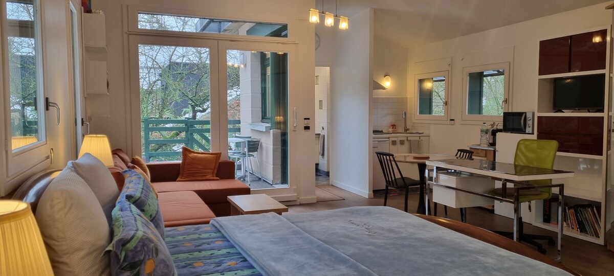 Sumptuous studio of 40 sqm bathed in natural light, set in an idyllic green setting surrounded by a beautiful garden. Enjoy the tranquillity of a private estate that is unique in the region, situated in the heart of a vast natural park, with a golf course on one side and Lake Héron on the other. High-quality 160 x 200 cm queen-size bed, comfortable sofa, kitchenette, bright bathroom, WC. Private terrace 12m2 in the heart of nature. Self-contained apartment, self access, free parking. Great wifi speed for remote work.