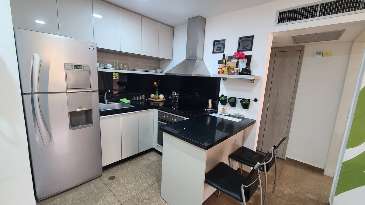 Enjoy the originality of this quiet and central accommodation with fiber optic internet and equipped with all services. Private access to the beach and beautiful social areas, spectacular pool, caney and direct contact with the sea, unbeatable location. since it is a 5-minute walk from shopping centers (Caribean mall) and important hotels such as Maremares and the golf course. This apartment is newly remodeled and equipped. It is delivered with linen, towels, water, coffee, etc.