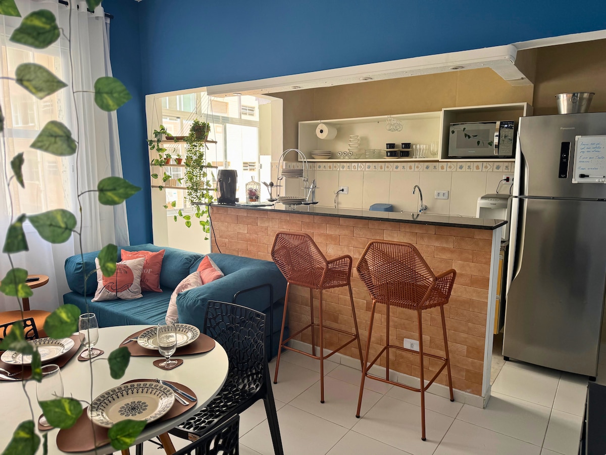 Cozy apartment and great location. Located in the best neighborhood of Santos, 50 meters from the beach and two blocks from Praia Mar shopping mall. Close to shopping centers, bakeries, bars, restaurants, banks, markets and pharmacies. Great location for those who come to practice sports events such as Triathlon, races and water events as it is close to the starting point. Perfect for home office and for couples with kids. Full kitchen with everyday utensils