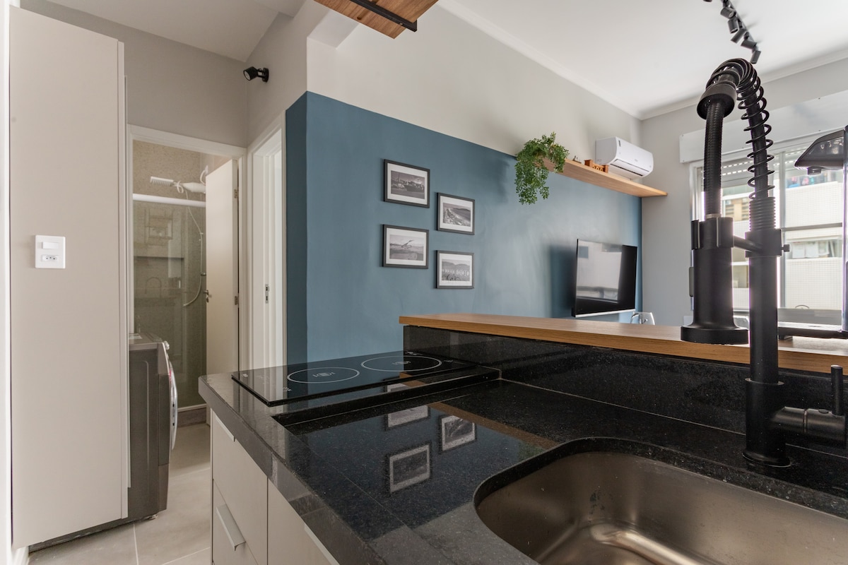 Modern 1-bedroom apartment and recently renovated on Avenida da Praia, near channel 4, with a side view of the sea and next to bakeries, markets, restaurants, bars and everything you need a few meters away. We are just a 10-minute walk from Shopping Praiamar and Praiamar Corporate, and in an excellent central location for those who need to get around Santos.