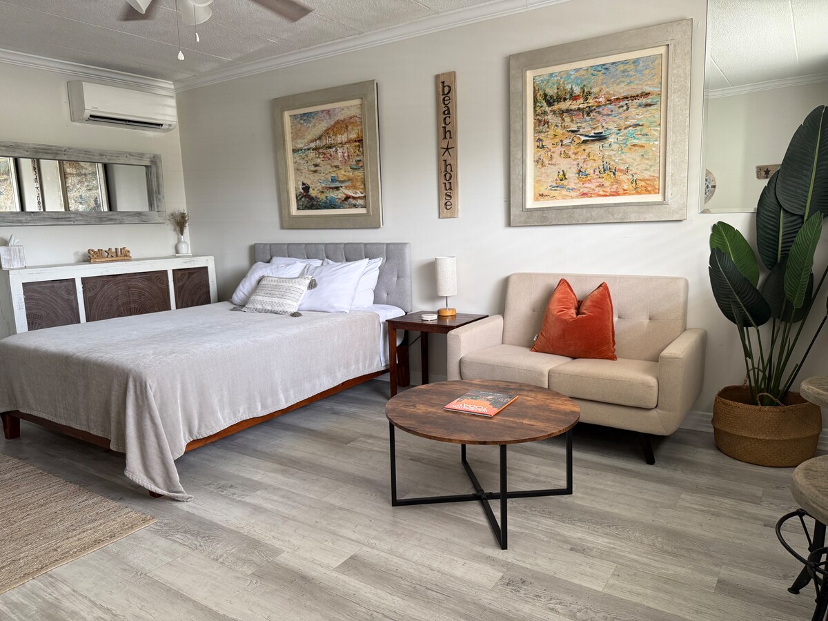 The Seaside Sanctuary is a stylish, retro-chic studio, with a comfy queen bed, spacious bathroom, and plenty of space to relax and unwind. Located across the street from the intercostal waterway and several amazing restaurants, there is no need to drive…simply walk to some great food and beautiful views :)
