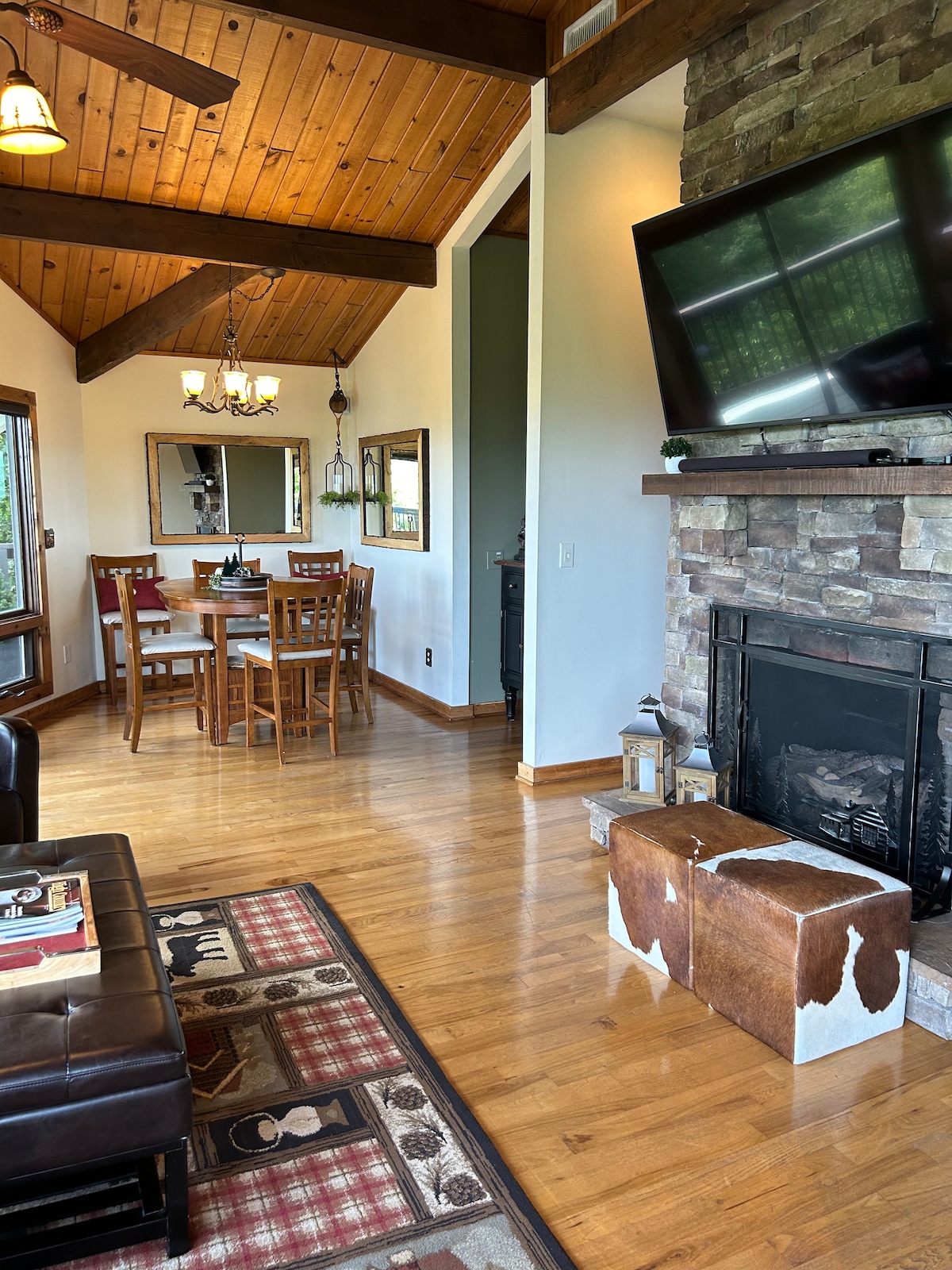 🌲 Secluded wooded setting near Boone, Blowing Rock & Parkway 🛏️ King bed, queen bed, queen sleeper in shared space 🍳 Kitchen w/ stainless appliances, island, essentials 🖼️ Local art, wood accents, curated rustic charm 🔥 Front porch, hot tub, fire pit 🎿 8 mi to App Ski, 10 to Sugar, 18 to Beech 📶 Wi-Fi, smart TV, games, washer/dryer 🥾 Trails, waterfalls & Julian Price access 🌌 Stargazing, quiet nights, mountain air 🧺 Towels, linens, starter toiletries & coffee provided