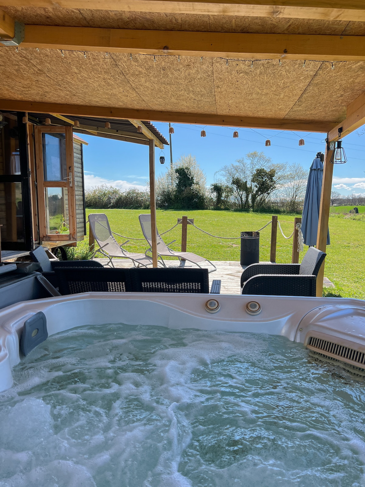 The Roulotte is a brand new, cozy little wooden house on wheels that was completely rebuilt this year. It was designed and furnished with a lot of love for detail to offer its guests a quiet and relaxing stay. The Roulotte is perfect for couples or solo travelers who want to escape the stress of everyday life and relax in the midst of nature. On the terrace you can relax in the private hot tub and enjoy the view of the stars