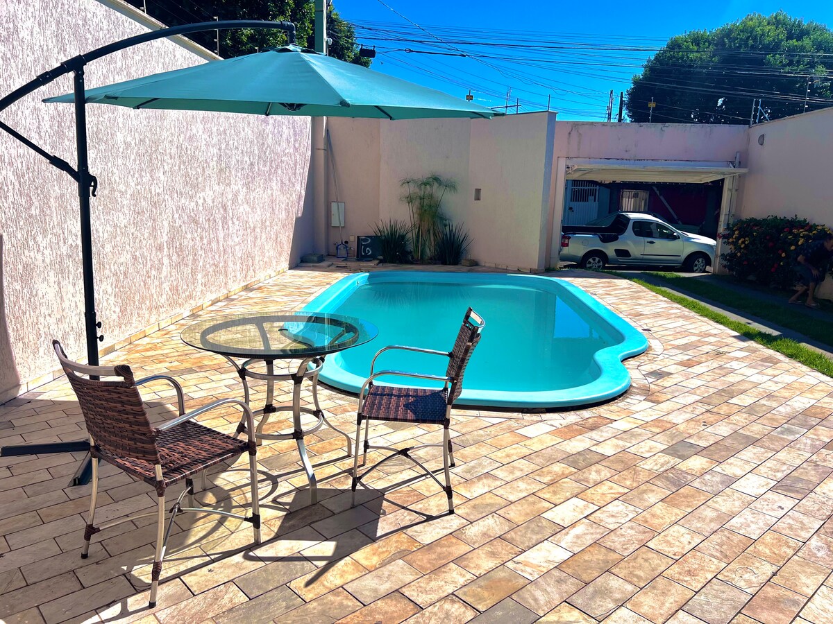 Feel at home and forget your worries in this quiet and pleasant place! For business or leisure, with comfort and safety. Large house with 200 square meters of built area and excellent location, close to Brasília Avenue with lots of entertainment, bars, restaurants, as well as pharmacies and supermarkets. It has 2 large bedrooms and a suite, all with air conditioning. Living room with TV and fan, full kitchen, garage and laundry area with washing machine.