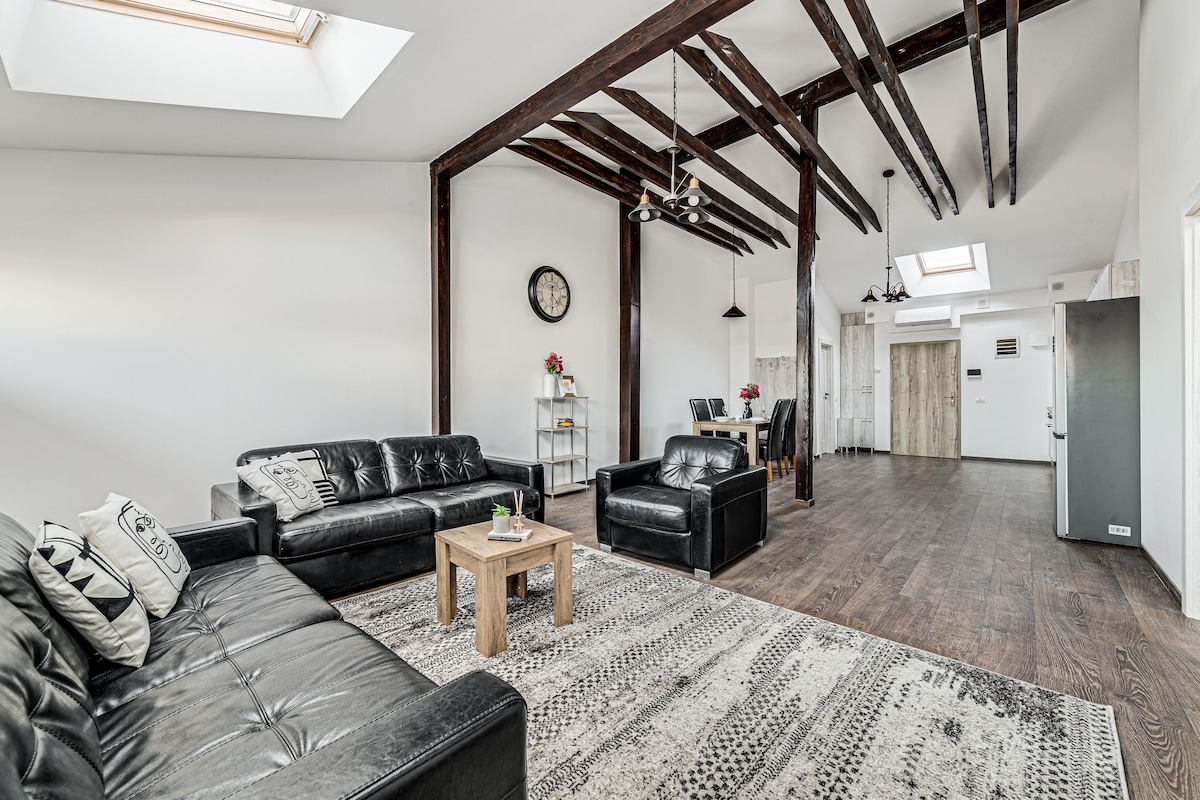 The apartment is located in the city center, in an excellent area, just 2 minutes from the Theatre, restaurants, pubs or park. SkyView consists of two bedrooms with queen size beds, two bathrooms, a spacious living room with smart TV and a fully equipped kitchen. From the bedroom or bathroom, guests can look directly at the sky through the Velux windows. SkyView is designed to provide a comfortable space for couples, families or business travelers who are looking for a memorable stay in Arad.