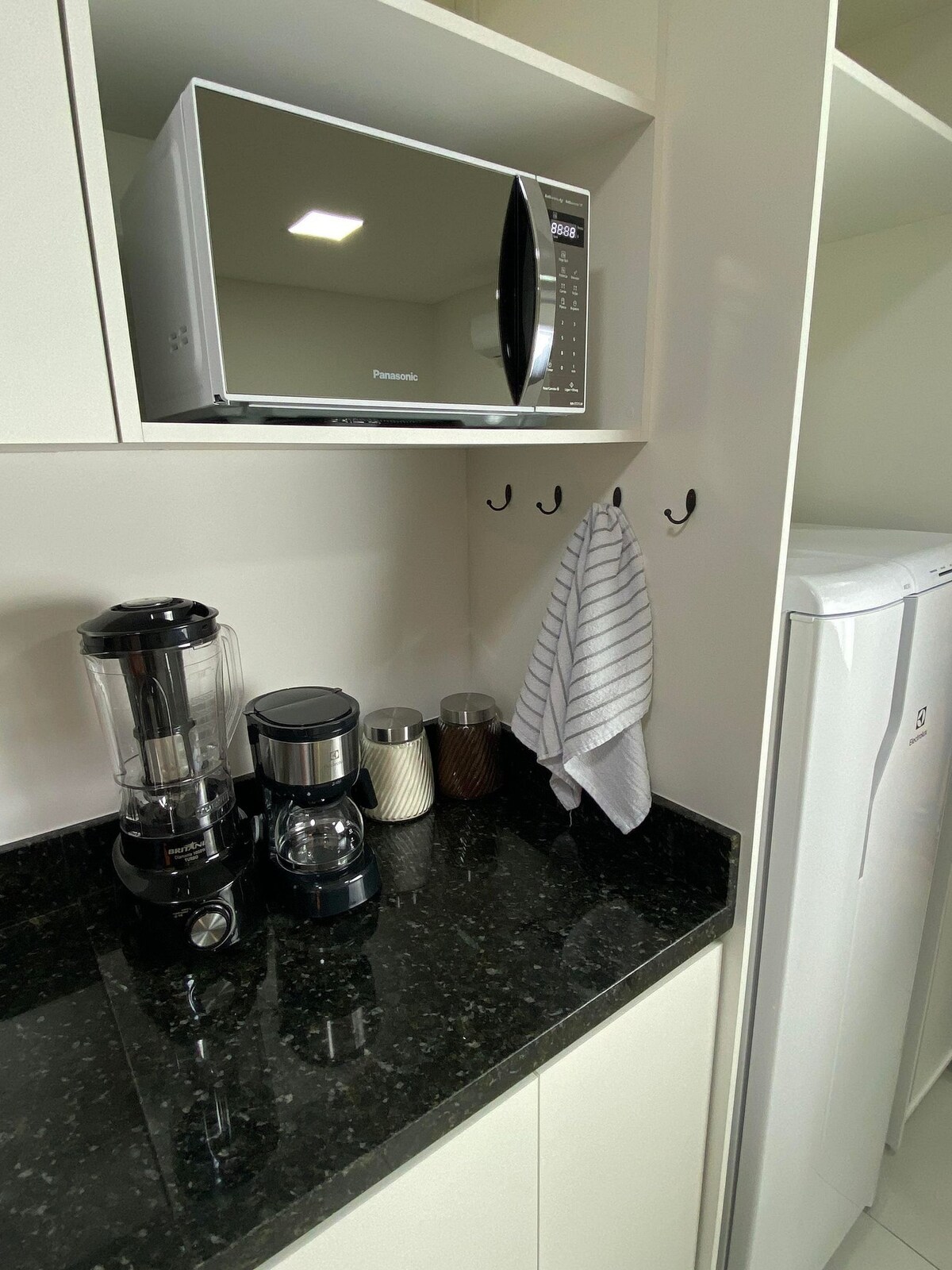 Estiloso Studio temático "Tropical Forest"! Super refinado, confortável e luxuoso, ideal para pessoas com estilo buscando conforto e praticidade. Cama Queen linha Benvenutti, super confortável. TV Smart 43" com streaming. Wi-fi potente. Cozinha completa equipada com panelas e utensílios Tramontina, pratos Porto Brasil, copos e taças de vinho. Cafeteira e liquidificador. Fornecemos café em pó, açúcar e sal, além de sabonetes e xampú. Materiais de limpeza também serão fornecidos.