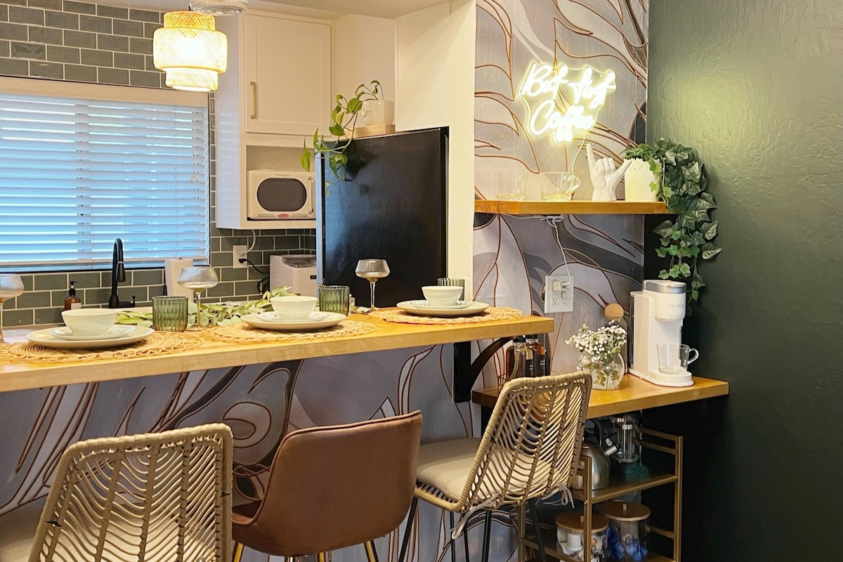 Urban, modern guest house at the base of Camelback Mountain! Stay in the heart of Arcadia within walking distance to great hiking, amazing restaurants and shopping. The studio apartment has a private entrance to an unshared outdoor space with views to camelback mountain. Relax in this newly renovated, cozy, modern space featuring a full-sized kitchen, large bathroom, walk-in-closet, and washer and dryer. We hope you enjoy your stay!
