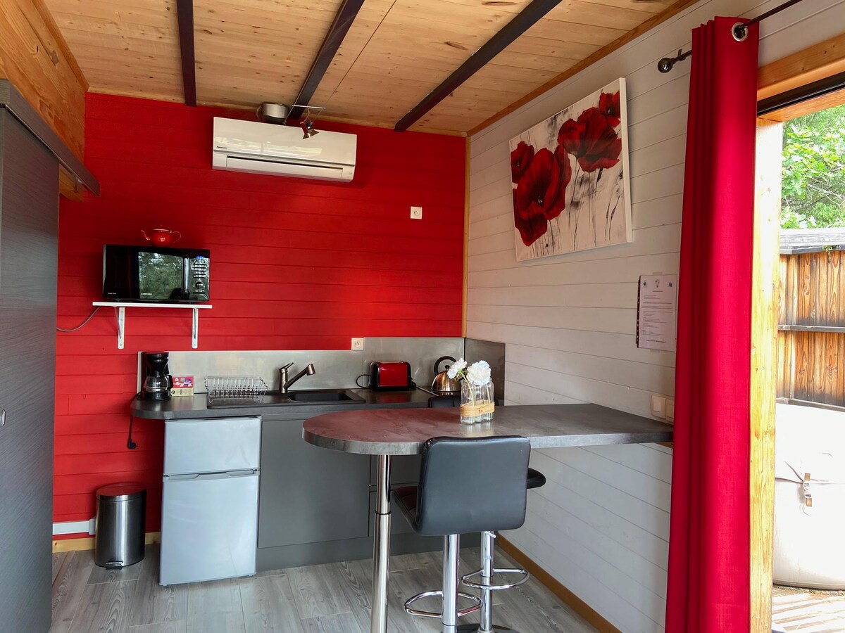 As a couple, with friends and family, come and relax between pine trees and scrubland. A wooden terrace with pergola, BBQ, summer kitchen, armchairs, table and chairs, surrounds the accommodation. On sunny days, enjoy the deckchairs and in summer, cool off in the spa (from June to September, never heated). If the temperatures are less mild, sit on the terrace around the fire pit under the polar blankets (October to May)