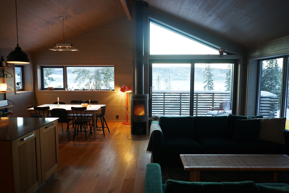 In this fantastic little mountain village Ottsjö, our newly built house is in a high position overlooking the mountain world in Åre. The house is 76 sqm with panoramic windows and beautiful material choices. In this house, you will feel like you are outdoors even when you are sitting inside by the stove with a cup of tea. Just behind the house, there are several prepared cross-country trails, snowmobile trails, hiking trails and proximity to fine fishing. A perfect house for friends and families with children who also want to bring their dog.