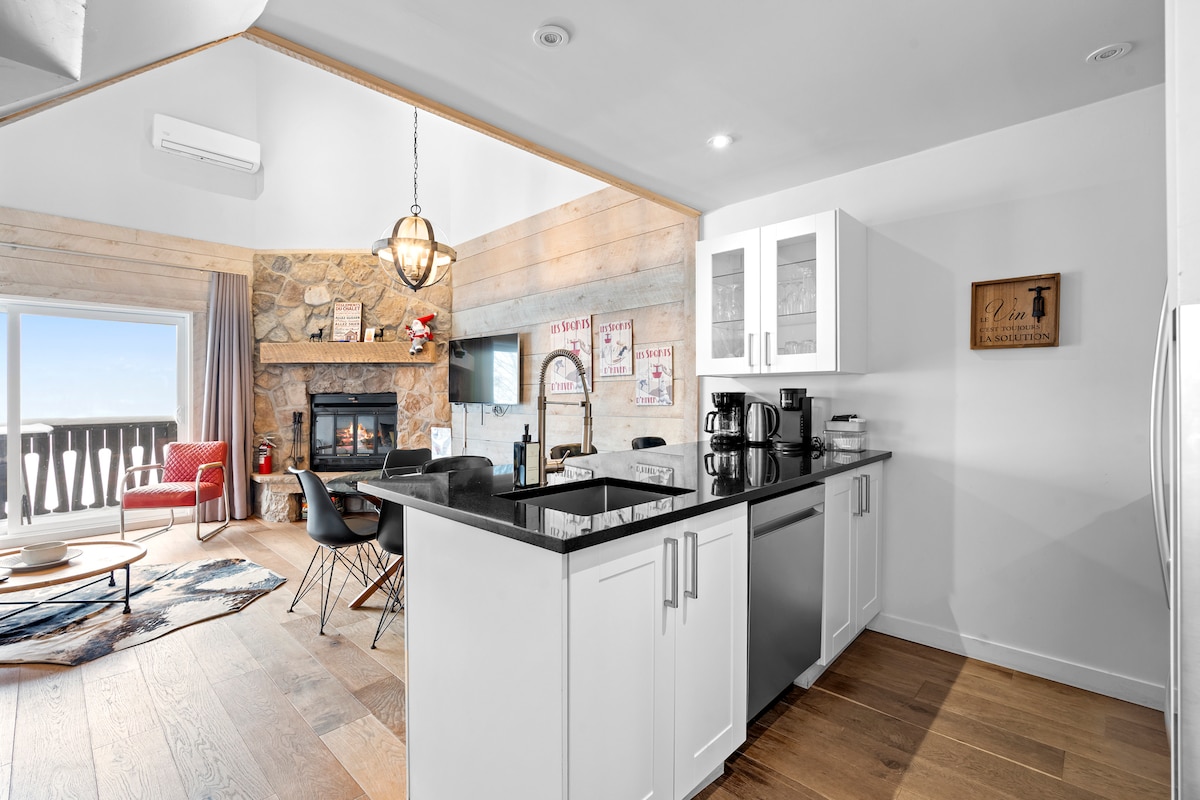 This charming two-storey condo offers year-round views of both Lac Tremblant and Mont-Tremblant mountain. The main floor features a bedroom with two twin beds, while the mezzanine master offers a king bed and sweeping views. An open-concept layout with full kitchen, gas fireplace, and cozy living area creates an inviting retreat—perfect for relaxing after days on the slopes, trails, or exploring the village.