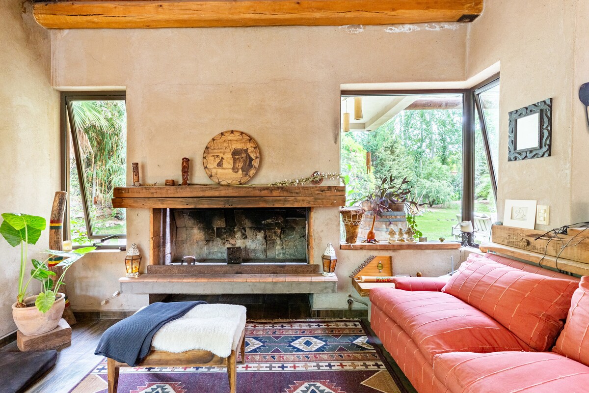 The house is located a few blocks from Plaza de Chacras, and in a residential area with several services. The entrance is on Medrano Street, through an automatic gate and an alley with an old tree that connects to the garden in the heart of the block. The house has warm spaces, a suite with a king-size bed and a bathroom with a Scottish shower. Equipped kitchen, barbecue, wood-burning fireplace, mini-pool and good sound system. Quick access to the Wine Route, the Andes Mountains and the Mendoza River.