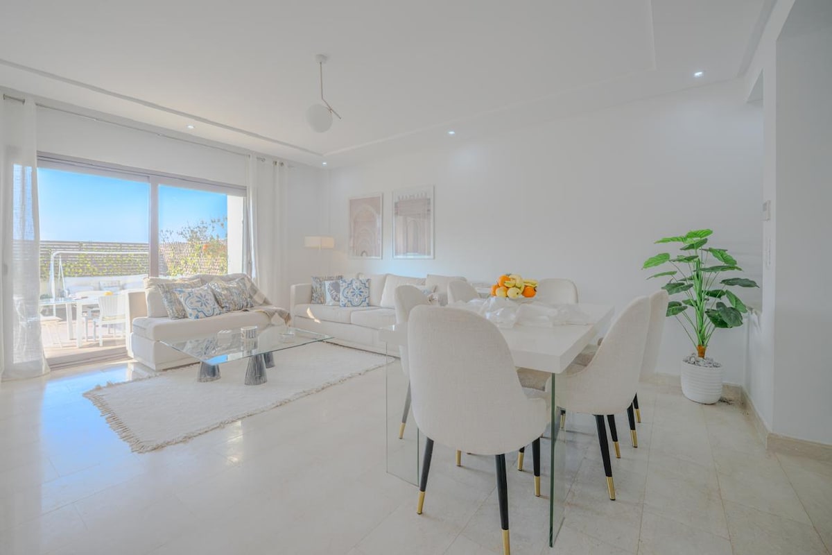 Luxury New apartment in Gammarth touristique with a sharing community pool, 2-minutes walk to the beach and Aqua viva. It is situated next to Carrefour-hotels, clubs, restaurants, and only 10 minutes away from the city center La Marsa plage. The property features a lovely living and dining room, a modern well-equipped kitchen, and a dryer. There is a large terrace with an outdoor dining table. It includes three master bedrooms, each with its own private bathroom, and one bathroom for guests.