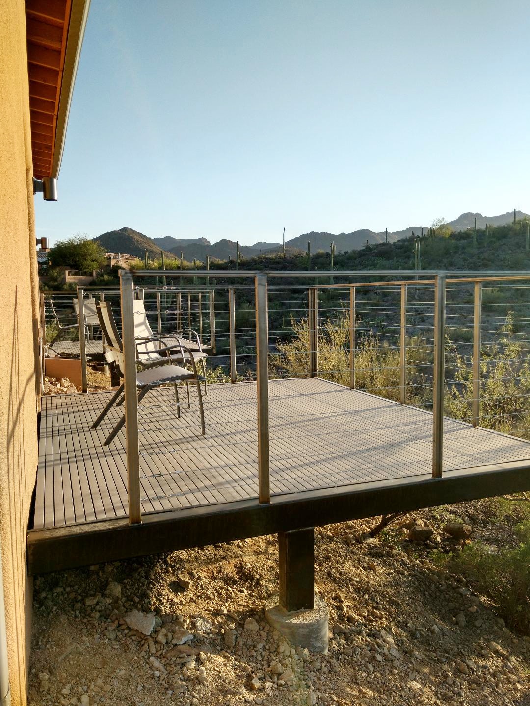2017 guest house in Tucson Mountain foothills adjacent to Sweetwater Preserve (14+ mi.s of trails: mountain biking, horseback, running, & hiking)! Enjoy the giant soaking tub, BBQ grill, sunsets & patio. A full kitchen, sitting area, bath & BR are downstairs (550 sq. ft.). Up a 90-degree ladder to BR/retreat space, wonderful for getaway views. Our property is a 3-acre lot w/ desert flora/fauna, stars, & quietness, yet only 10 mi. from UA. Horses add to the ambiance with a taste of ranch life.