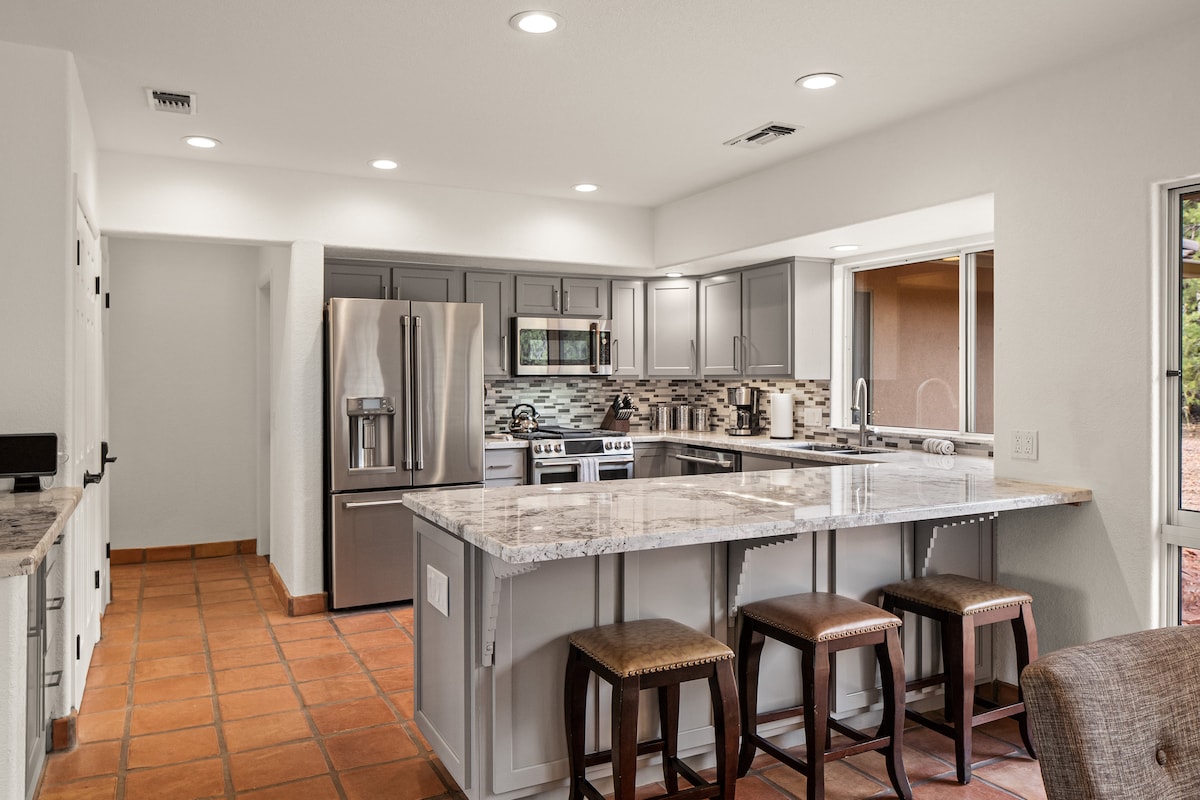 This LARGE (+4,300 sq ft) Home offers some of the most Breathtaking & Expansive 180 Degree Views of the Red Rocks in all of Sedona (which is what we all come here for, right?) And this is because this two-story home is perched upon a hilltop and borders MILES and MILES of National Forrest (very private!) On both levels of the home, you’ll have more deck space for entertaining and relaxing than you’ll know what to do with! And yes! Fire Pit and BBQ included for your use!