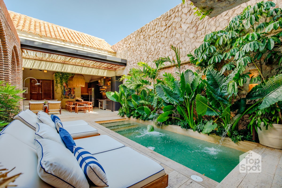 🏆 AD Design Icons Awards Finalist 2022 - Featured in Axxis 2022 Yearbook as one of Colombia's Best Homes Casa Azzurra Getsemaní: designer house of 5,812 sq ft for 10 guests in the vibrant Getsemaní neighborhood. Ideal for large groups, family reunions, and special celebrations. Includes: complimentary airport transfers (round trip), daily gourmet breakfast, private concierge 24/7, and daily housekeeping service. Customize your stay with catering from our private chef and exclusive experiences.