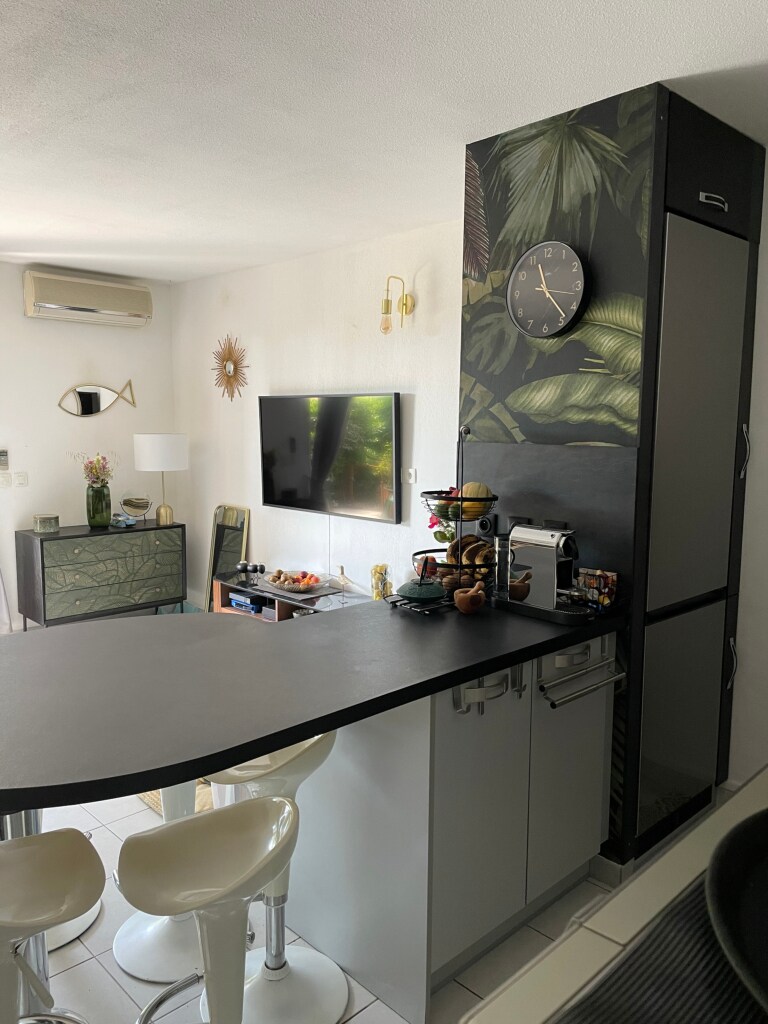 On vacation or traveling, come and relax in this charming furnished and equipped T2, air-conditioned and quiet, in villa garden res-de-jardin with independent entrance. Bedroom with double bed and 125x180 convertible sofa, in the living room. Umbrella bed upon request. 1 free parking space inside the property Beaches and shops 9min walk. Linens provided. No smoking allowed No pets.