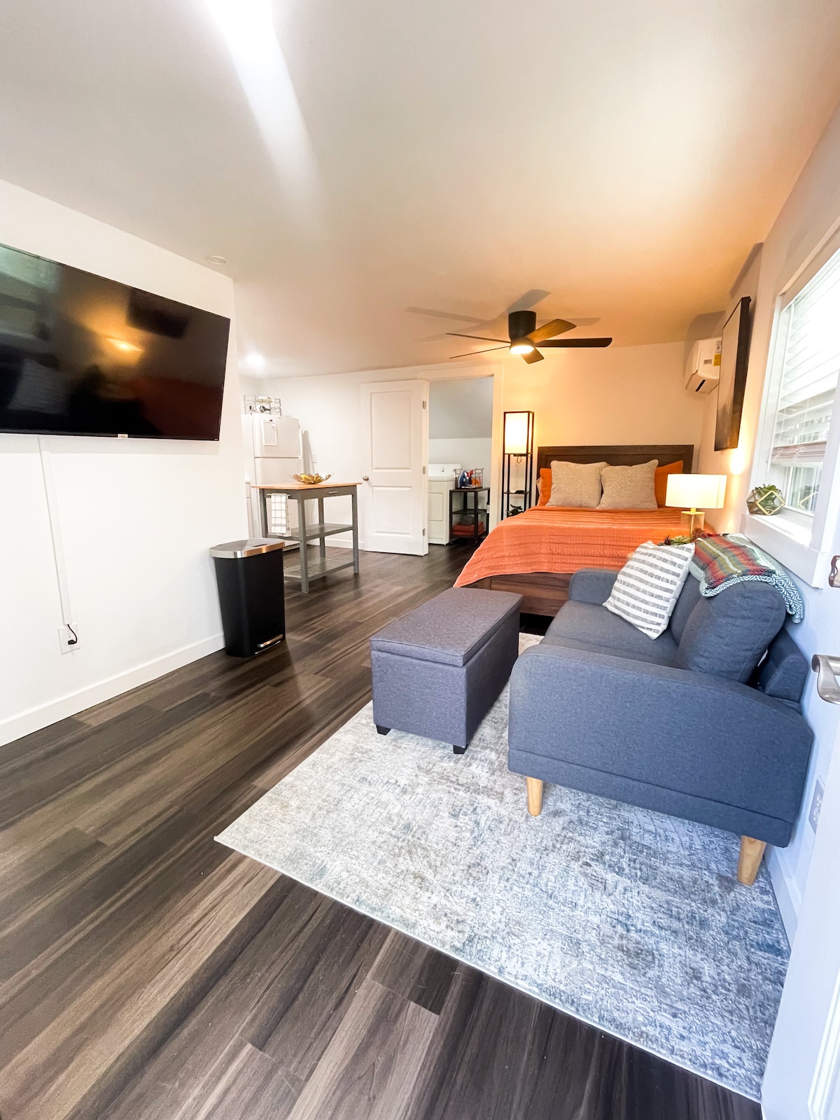 We are located in the historic Fairmount neighborhood, just a 10 minute walk from Magnolia. The space is a modern, newly built, above-garage studio apartment with vaulted ceilings, full kitchen, dining area, patio, entertainment center, queen sized bed, and bathroom with walk-in shower. It is full of amenities such as dedicated wifi gateway, access to streaming services, Leesa mattress, premium coffee, and much more! Our goal is for you to feel comfortable and at home during your stay!