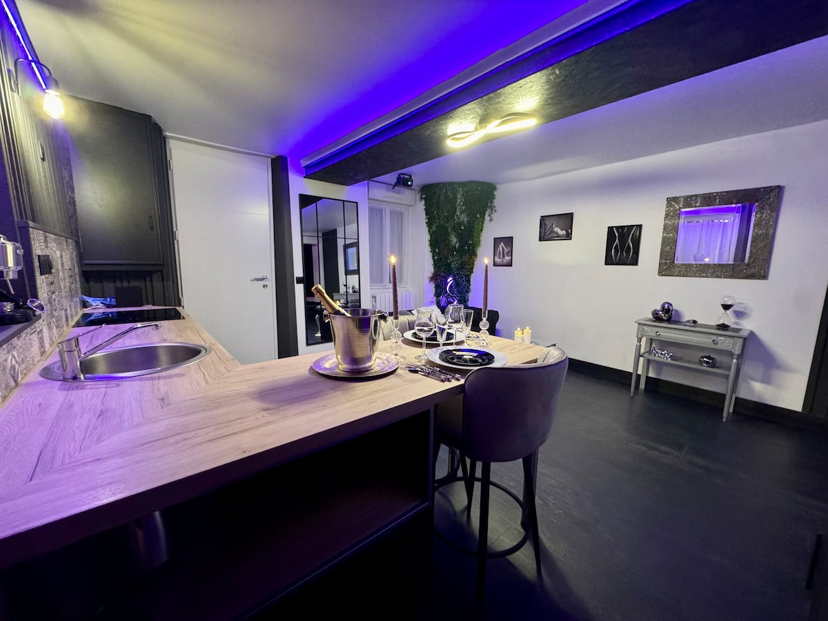 Come and spend an unforgettable time in complete discretion in this 70 m² house dedicated to your well-being. The suite has a 2-person SPA and a 2-person sauna. The spacious room has equipment to spice up your love life (St. Andrew's cross, Tandra sofa, mirror above the bed, etc.) The living room has a video projector and a fully equipped kitchen. You will appreciate the decoration and the atmosphere of our accommodation, with controllable LEDs.