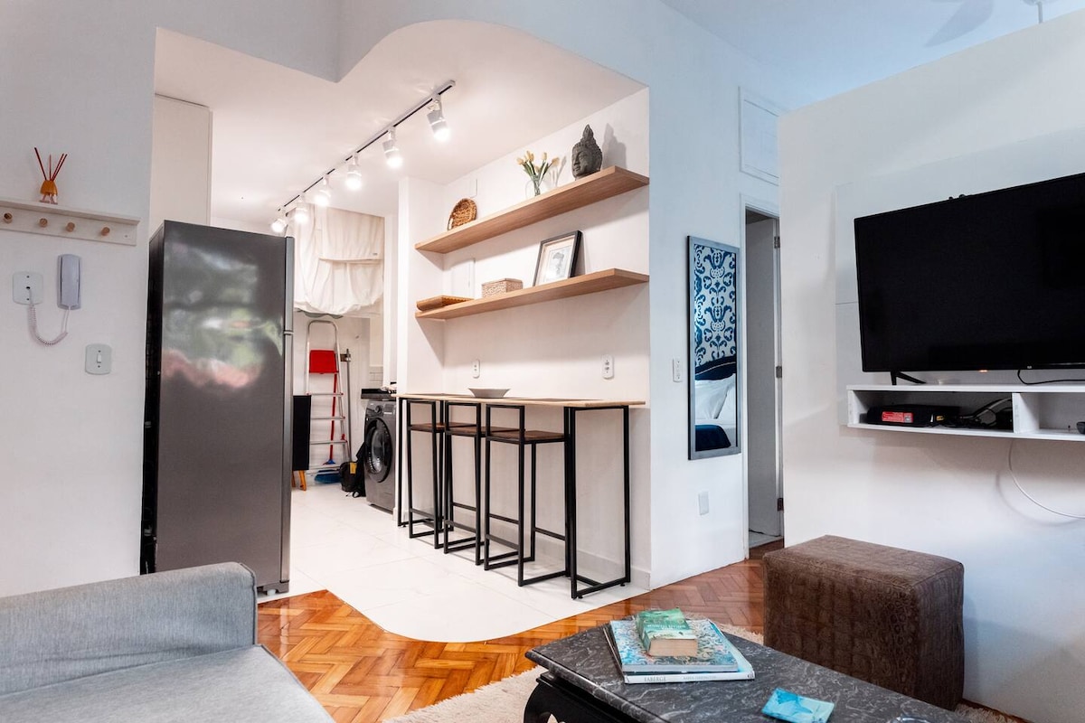 - Comfortable studio in an excellent location, with elevators and air-conditioning, Wi-Fi internet, Smart TV with Chromecast, washer and dryer, safe and fully equipped kitchen. - Between the beaches of Ipanema and Copacabana, 4 blocks from each - Safe neighborhood with 24-hour doorman - View of the green - Public Transportation (Bus and Subway), beaches, restaurants, bars, shops and supermarkets within walking distance, a few minutes - Ideal for couples and business travelers - Self check-in
