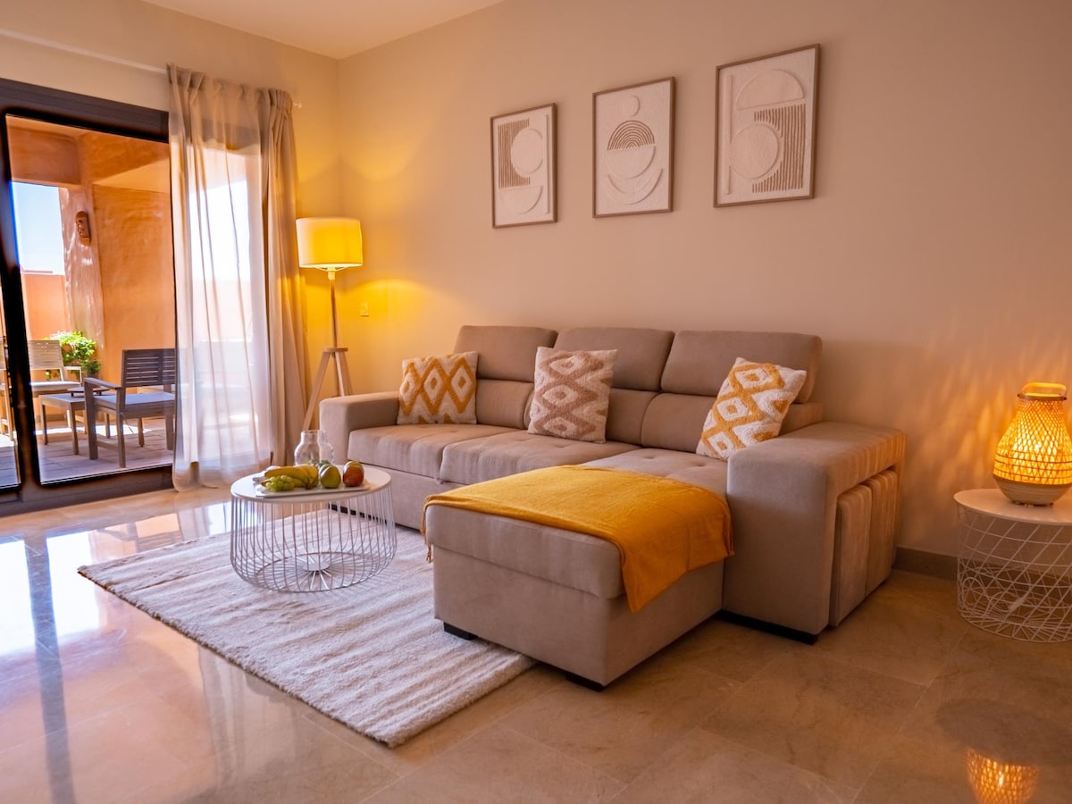 This spacious, fully renovated two-bedroom apartment is located in the Sotogrande Marina, a short walk from the beaches. The master bedroom has a king-size bed and an ensuite bathroom. The guest room offers twin beds and a private bathroom. Furnished with brand-new furniture, the apartment includes bed linens, towels, free Wi-Fi, and access to streaming services like Netflix. The living and dining area extends to a private terrace, complete with a television and fireplace for a cozy ambiance.