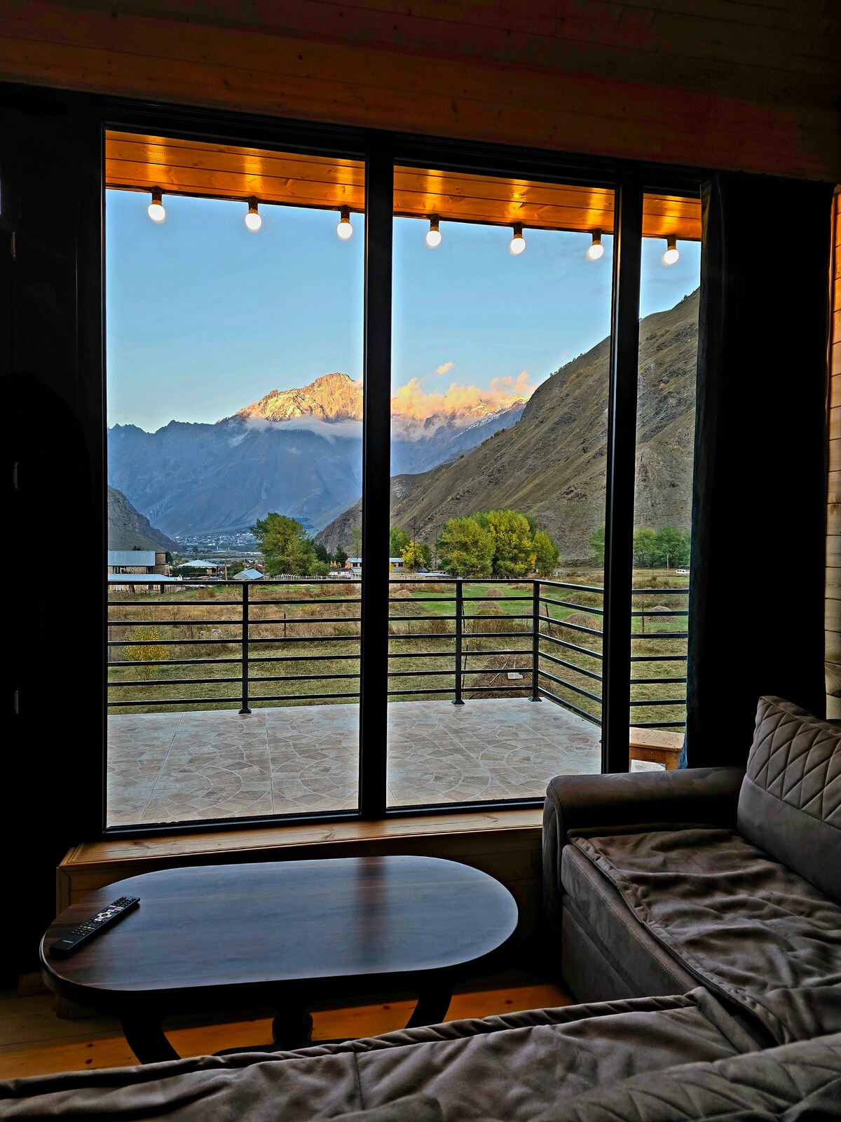 The place is very peacfull and privat, views are very special and free, we have Privat Big terrace, Unically peacfull bedroom with panoramic view of great Kazbegi Mountains, big yeard and outdoor furniture .