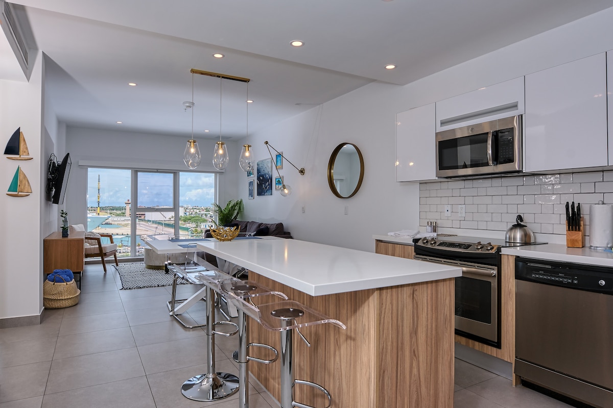 Enjoy your stay to the max at the comfort of of this wonderful, coastal beach Studio. Featuring great views of the Ocean, Cruise ships and town. A perfect choice for a couple stays. Located on the 6th floor of Harbour House, a complex open at the beginning of 2021. Everything you need in this cozy space is offered in this 379 sqft. (aprox). Kitchen is equipped with necessary utensils and small kitchen appliances for making your stay comfortable. King size bed and TV. For 2 people Max. Please